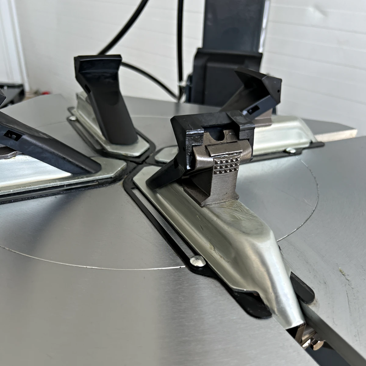 - Управление станком осуществляется с помощью педалей. Специальная скоба-ограничитель позволяет оператору легко находить педали отжима и вращения стола.